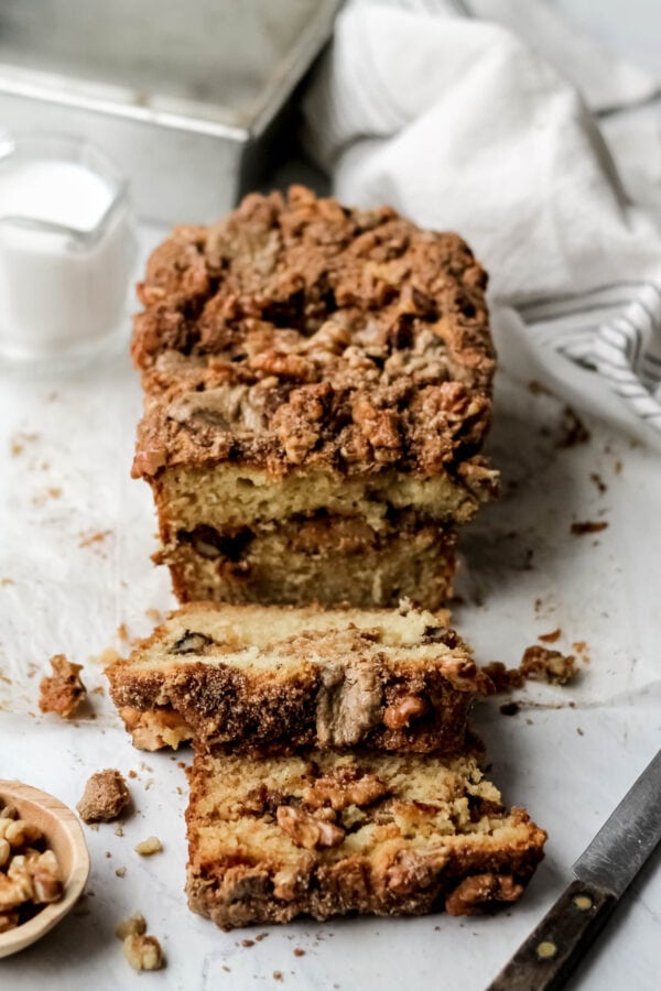 Important: Be sure to line your 9 x 5″ loaf with parchment paper since the walnuts and brown sugar get caramelized on the sides. Also, place the loaf pan on a rimmed baking sheet in the oven, in case you there is any spill over (there shouldn’t be, but just in case!).