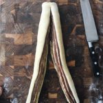 - Step 4 Trim last 1/2-inch off each end of log. With a sharp chef’s knife, cut the log in half lengthwise, leaving about an inch attached at the top. Lift one side over the next and begin to twist, trying to keep the cut sides facing out, which looks super pretty. Don’t worry if this step makes a mess, just transfer the twist as best as you can into the prepared loaf pan. Cover the loaf pans loosely with plastic wrap, and let rise for 1-1 1/2 hours depending on the room temp temperature.