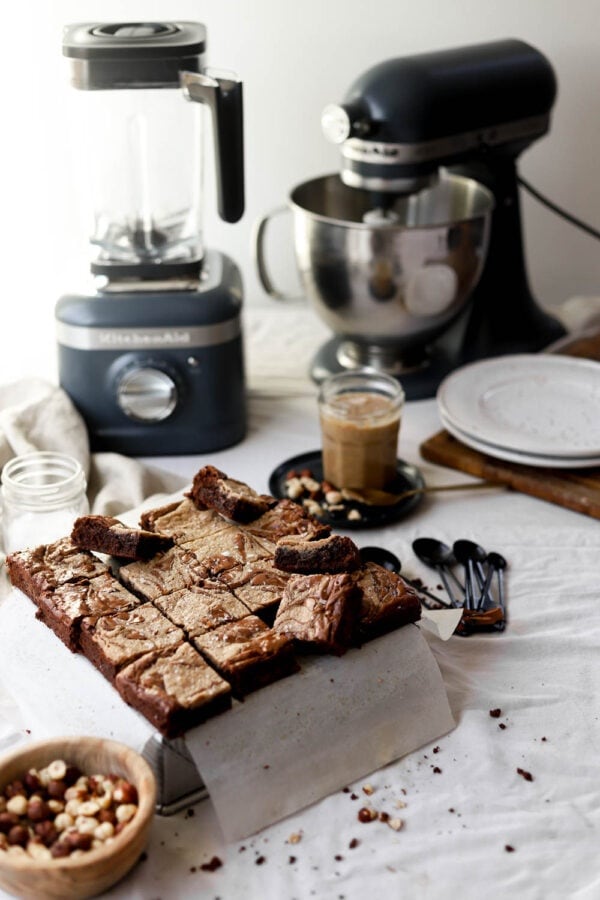 They’re extremely chocolatey, rich, and so comforting at the same time. Swirling homemade hazelnut butter on top takes these brownies to another orbit. Seriously, roasting our hazelnuts add so much flavor and nuttiness that’s perfectly with the dark chocolate.
