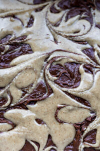 I let the blender do all of the work, and within 3-4 minutes, behold! You’ve just made your own nut butter, my friend! All that’s left to do is swirl this goodness on top of our rich brownie batter. Any leftover hazelnut butter should be kept in the fridge in an airtight container, and can be slathered on toast, or spooned over yogurt or ice cream.