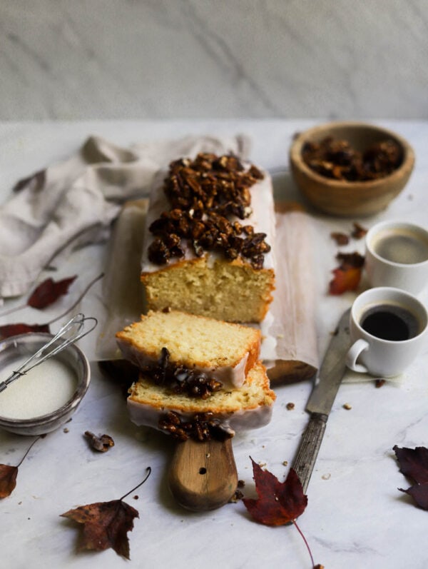 A rich pound cake made with olive oil and maple yogurt, a maple glaze, and scratch-made candied pecans spiced with a touch of cinnamon