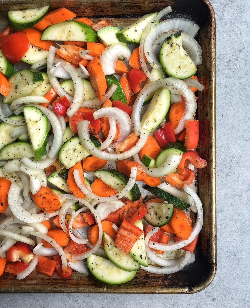 • Step 2 Chop the zucchini, carrots, and bell pepper in a large dice, and the onion in half-moons. Place the vegetables on a large baking sheet, and pour the avocado oil over all. Sprinkle kosher salt, pepper, and Herbs de Provence over, and mix well so that all of the veggies are coated with herbs and oil.