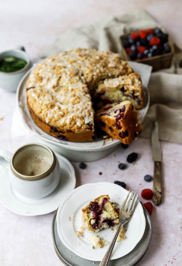 I highly recommend enjoying this cake when it is freshly cooled from the oven. The crumb is so tender, and the berries get very jammy and juicy. That being said, you’ll probably have leftovers, which you should wrap in plastic wrap, or put in an airtight container right away. Then, you can store the cake at room temperature for up to 3 days, but I really doubt if it will last that long. If you’d like to freeze the whole cake, or a portion of it, see the notes above.